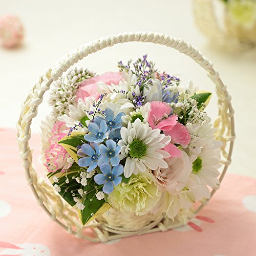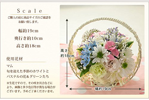 - マム・旬を迎えた季節のホワイトとパステルの花&グリーンたち。ハンドル付きミニバスケット。