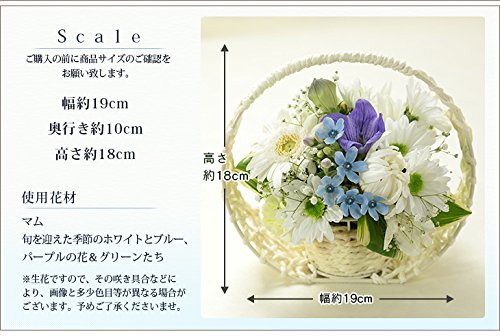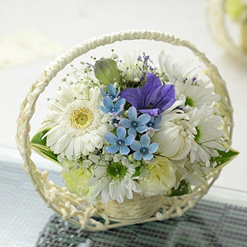 - マム・旬を迎えた季節のホワイトとブルー、パープルの花&グリーンたち。ハンドル付きミニバスケット。
