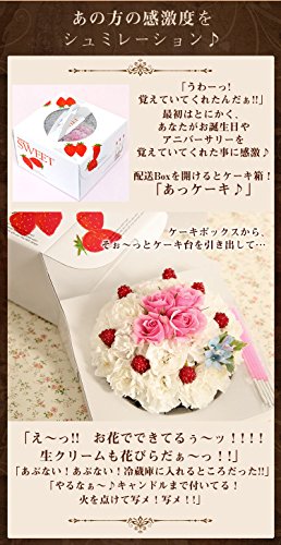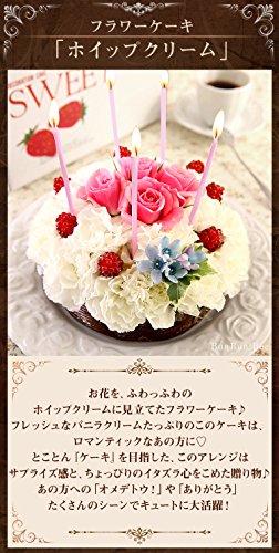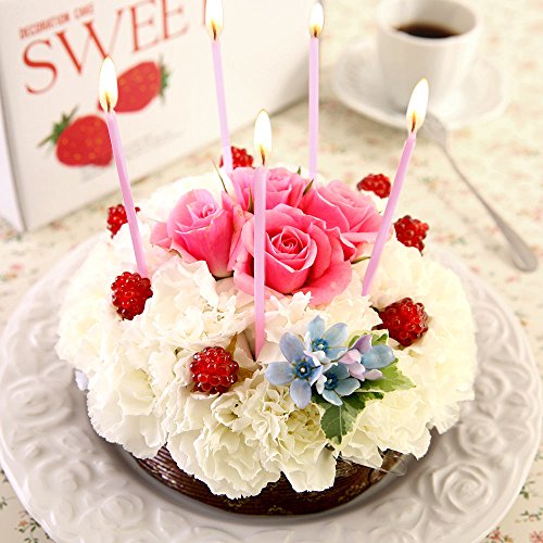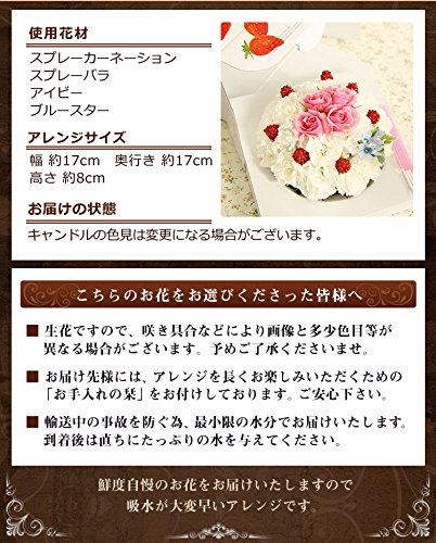 - 使用花材:スプレーカーネーション・スプレーバラ・アイビー・ブルースター。 使用資材:ラズベリーピック・キャンドル付。ケーキボックス入。