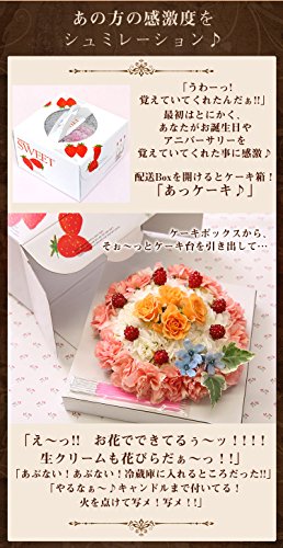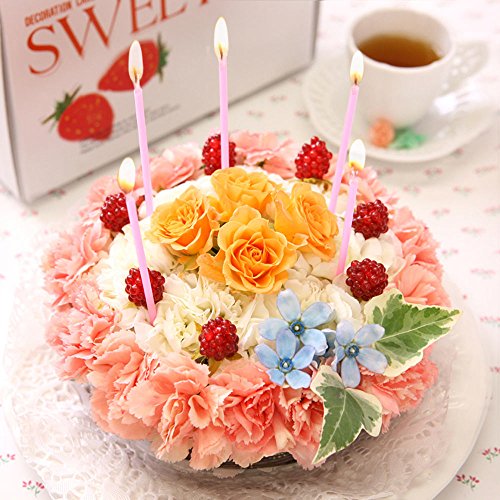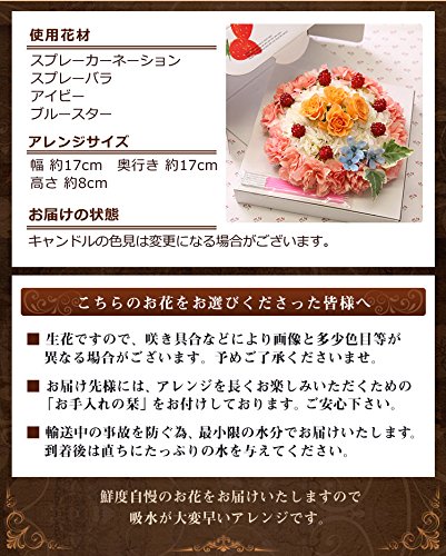 - 使用花材:スプレーカーネーション・スプレーバラ・アイビー・ブルースター。 使用資材:ラズベリーピック・キャンドル付。ケーキボックス入。