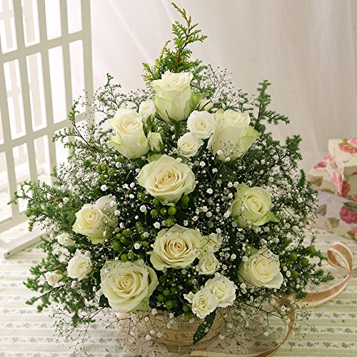 まるでバラの花のツリー。大人の雰囲気を漂わせる白バラと旬の花達で華麗なシルエットを作り上げたアレンジメント♪ここまでのボリューム感に送料込みで、まさかの価格です!!お花に精通しているあの方にも自信を持ってお贈りくださいませ。
