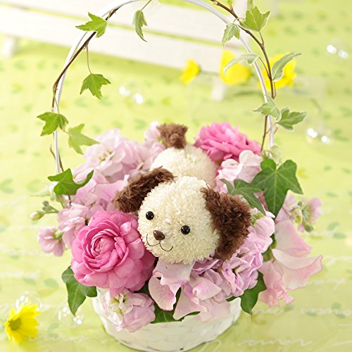 - ペットフラワー♪アレンジ「ワンコとピンク色の花」:ピンポンマム・ラナンキュラス・ストック・スイトピー・アイビー。目・鼻・しっぽ付き。バスケット入り。