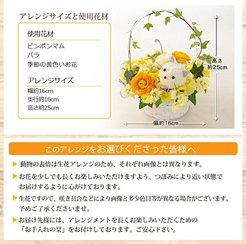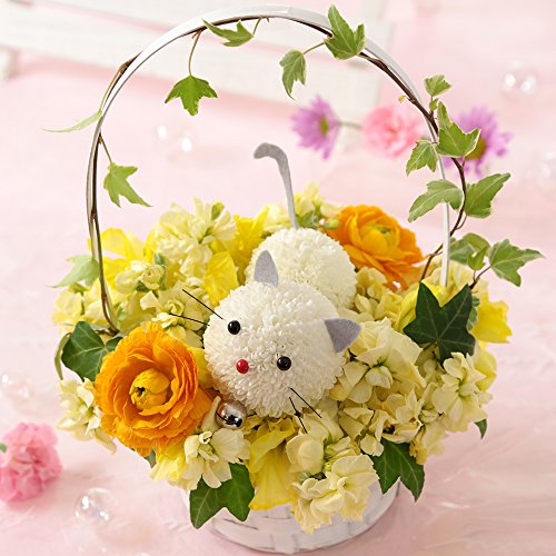 - ペットフラワー♪アレンジ「ニャンコと黄色い花」:ピンポンマム・ラナンキュラス・ストック・スイトピー・アイビー。目・鼻・しっぽ・ひげ・鈴付き。バスケット入り。