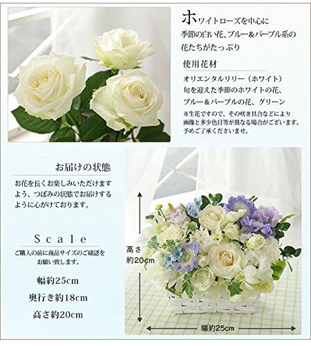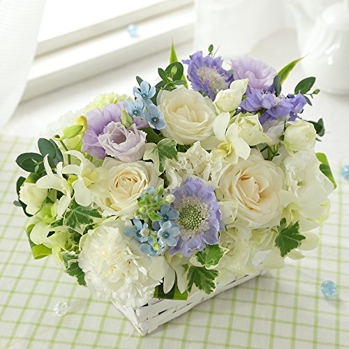 しなやかな美しさが際立つ白バラを取り巻くのは、たっぷりの旬の白い花たち。仕上げに淡いブルーとパープルの色花を添えた、上質の爽やかさがこぼれる美しいアレンジメント。あなたの想いがきっとあの方に届くはず。