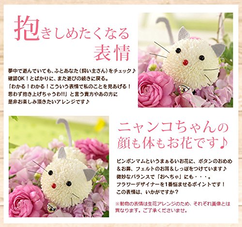 愛しい愛しいニャンコさんとの記念日や、ニャンコさん大好き!というあの方のお誕生日や お祝いにオススメの、花畑で遊ぶニャンコさんをイメージしたアレンジメント。 お花は旬を迎える、あま~いピンク色。
