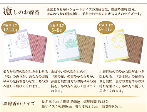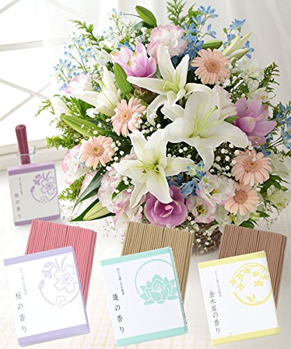 - アレンジ:幅約38cm×奥行き約30cm×高さ約45cm。お線香:長さ約9cm。お線香:50g。燃焼時間:約12分。