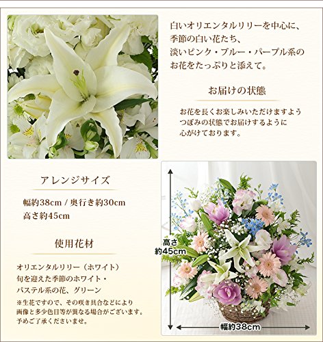 - オリエンタルリリー(ホワイト)・旬を迎えた季節のホワイトとパステルの花&グリーンたち。バスケット入。祈りと癒しのお線香ショート9cm