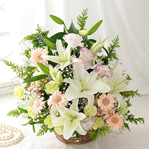 まばゆい純白のオリエンタルリリーを、旬のピンクホワイトの花達が取り囲む柔らかな印象のアレンジメント。甘い香りとともにあの方を偲びましょう。