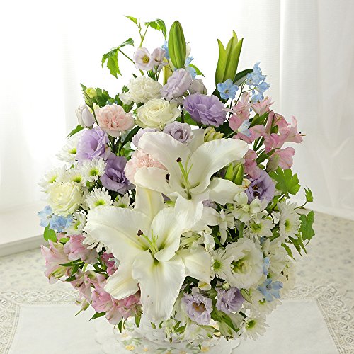 あの方にも届きそうな、芳香と大きな花形。存在感満点のホワイトのオリエンタルリリーを、旬の白い花とパステルなピンク・ブルー・パープル系の花達が取り巻く上品な華やぎが溢れるアレンジメント。陽気で明るいあの方の笑顔に重ねてお贈りになりませんか。