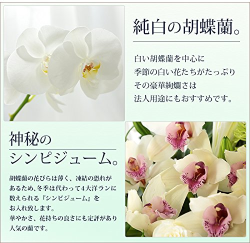 シルクのような質感と新雪のような白さが、圧倒的な美しさを誇る憧れの胡蝶蘭。その存在感を旬の白い花達が、力強くサポートしたボリューミーなアレンジメント。いつまでも変わらぬ、あの方への敬意を込めてお贈りになりませんか。