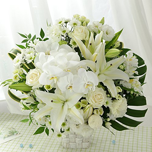 - コチョウラン(ホワイト)・オリエンタルリリー(ホワイト)・旬を迎えた季節のホワイトの花&グリーンたち。バスケット入。