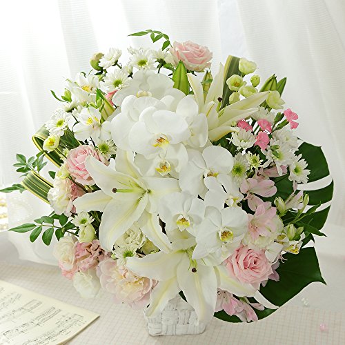 シルクのような質感と新雪のような白さが、圧倒的な美しさを誇る憧れの胡蝶蘭。その存在感を旬の白い花と柔らかなパステルピンクの花達が、力強くサポートしたボリューミーなアレンジメント。穏やかなあの方の笑顔と、いつまでも変わらないあの方への敬意に重ねてお贈りになりませんか。