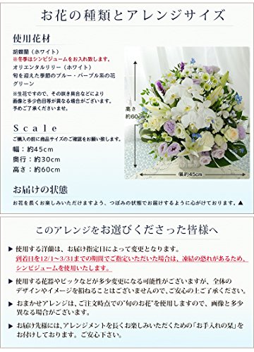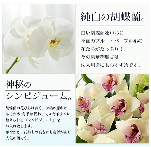 シルクのような質感と新雪のような白さが、圧倒的な美しさを誇る憧れの胡蝶蘭。その存在感を旬の白い花とブルー・パープル系の花達が、力強くサポートしたボリューミーなアレンジメント。爽やかなあの方の笑顔と、いつまでも変わらないあの方への敬意に重ねてお贈りになりませんか。