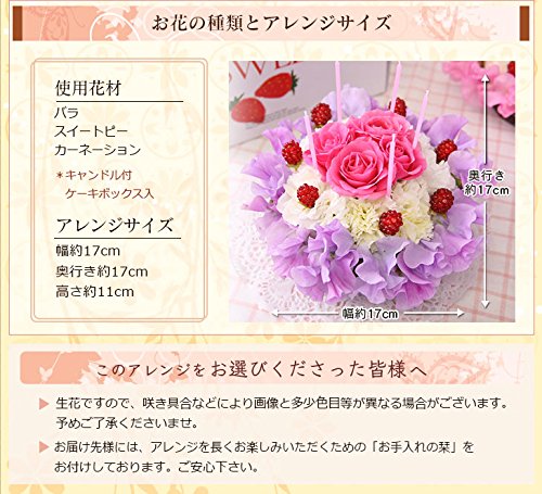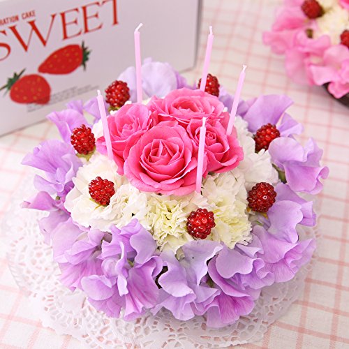 - バラ・スイートピー(ラベンダー)・カーネーション。キャンドル・フェイクラズベリー付・5号用ケーキボックス入。