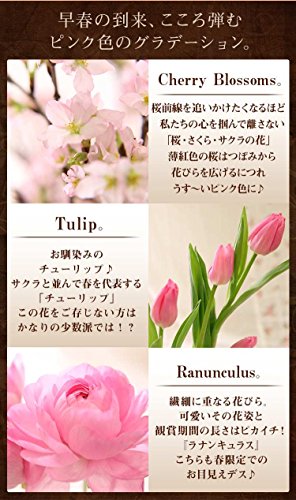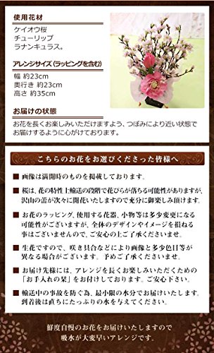 - 使用花材:ケイオウ桜・チューリップ・ラナンキュラス。使用資材:ラッピング付・籐製花器入り。