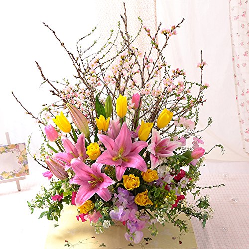 - 桜・オリエンタルリリー・旬を迎えた季節の花&グリーンたち。ラッピング付、バスケット入。