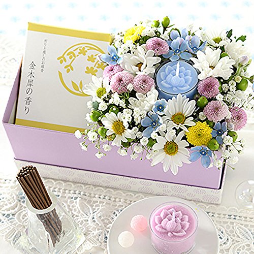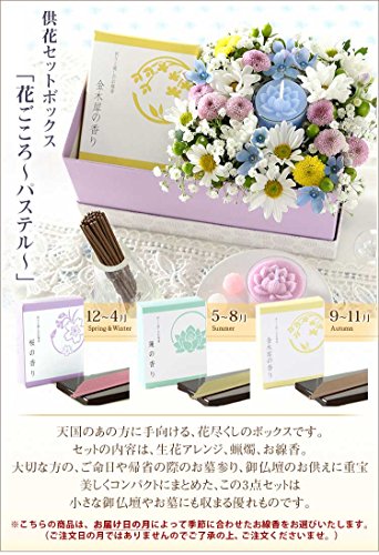 - 使用花材:スプレーピンポンマム・スプレーマム・カスミソウ・ヒペリカム・ブルースター。 使用資材:季節のお花のお線香・蓮のキャンドル付・紙製蓋付きボックス入り。 ※季節によって使用する花材が変更になる場合がありますが、 全体のデザインやイメージを損なうことはございません。