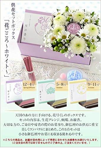 天国のあの方に手向ける、花尽くしのボックスです。セットの内容は、生花アレンジ、蝋燭、お線香。大切な方の、ご命日や帰省の際のお墓参り、御仏壇のお供えに重宝。美しくコンパクトにまとめた、この3点セットは小さな御仏壇やお墓にも収まる優れものです。