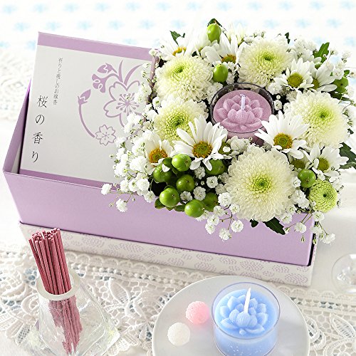 - サイズ: アレンジ:幅約10cm・奥行約10cm・高さ約10cm。 お線香:長さ約9cm。 キャンドル:直径約4cm・高さ約2.5cm。 紙製蓋付ボックス:幅約20cm・奥行約10cm・高さ約10cm。