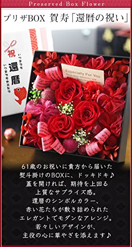 61歳のお祝いに貴方から届いた熨斗掛けのBOXに、ドッキドキ♪蓋を開ければ、期待を上回る上質なサプライズ感。還暦のシンボルカラー、赤い花たちが敷き詰められたエレガントでモダンなアレンジ。若々しいデザインが、主役の心に華やぎを添えます♪