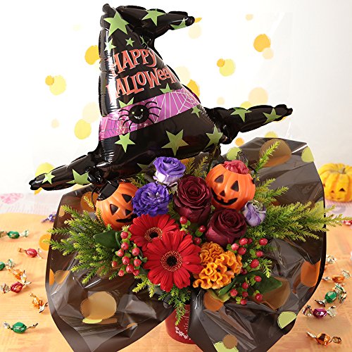 真紅のローズやガーベラの上に、ぽっかり浮かんだ大きな魔女の帽子。キュートな魔女からの贈り物!?大人可愛さが炸裂したアレンジです♪ハロウィンパーティのアクセントや、この時期にお誕生日を迎えるあの方に是非♪