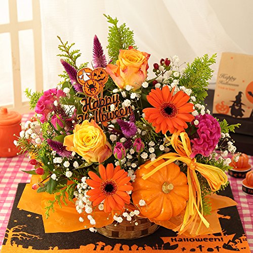 かぼちゃをメインに旬を迎えたお花たちを、オレンジ系でまとめてみました♪ かぼちゃとハッピーハロウィンのピックが雰囲気を盛り上げてくれます。 さりげな~く!?ハロウィンを意識したアレンジ! オススメいたします!!
