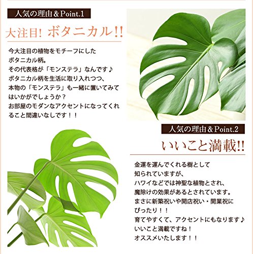 エキゾチックな葉型が、お部屋のモダンなアクセントに素敵。“モンステラ”とは湧き出る水という意味なのだとか・・♪見た目の美しさ・育て易さに加えて、金運を運んでくれる樹として、新築祝いや開店祝い開業祝にひっぱりだこです!