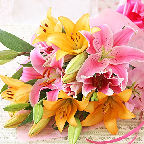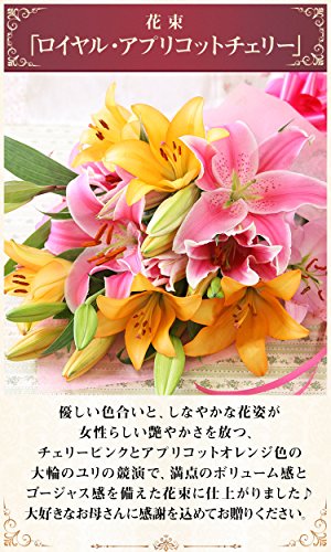 優しい色合いと、しなやかな花姿が女性らしい艶やかさを放つ、チェリーピンクとアプリコットオレンジ色の大輪のユリの競演で、満点のボリューム感とゴージャス感を備えた花束に仕上がりました♪ 大好きなお母さんに感謝を込めてお贈りください。