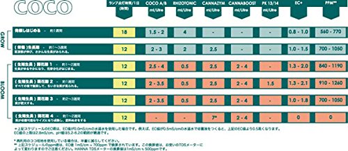 - CANNA Coco培地のようなクオリティーがきちんと保証されたココ培地といっしょに使えば、相乗効果が高まり生長期と開花期の両方で使用することができます