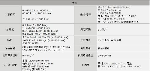 また、DT-8809Aでは、本体のメモリーキーを押して、その時の照度データを日時とともに99回メモリーします。データはパソコンにをダウンロー できるばかりでなく、本体のキーを押して照度値のデータを日時とともに見ることも可能です。