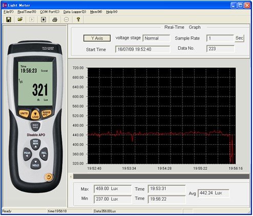 データロガー機能内蔵のDT-8809Aでは、日時とともに照度データ16,000メモリーし、パソコンに測定データをダウンロードすることができま す。データロガーの測定間隔は、1秒〜99秒の間で設定可能です。データロガーの測定開始と停止は99回実施でき、異なるデータファイルとして保存す ることができます。測定データは専用のファイル形式とテキストファイル形式で保存しますので、Excelでデータを見ることも可能です。