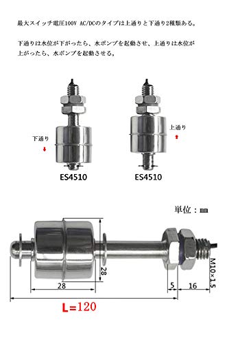- 3.最大スイッチ電圧100V AC/DCのタイプは上通りと下通り2種類ある。下通りは水位が下がったら、水ポンプを起動させ、上通りは水位が上がったら、水ポンプを起動させる。