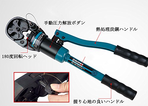 - 1:ダイス8種付、16~150mm²ケーブル、銅アルミ端子の圧着に生産された手動油圧ハイドロプライヤーです。DIN、AWG、JISの規格に適用です。