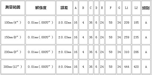 - 3.解像度は0.01mmで、誤差は±0.03mmで、測量範囲は150mm(6″)です。