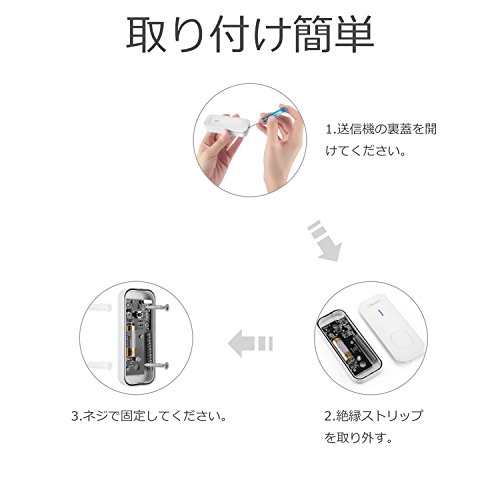 - 取り付けは簡単で、受信機を電源コンセントに繋げばいいです。発信機を付属の両面テープ或いはネジとねじ回しでお好きな場所に固定してお使い頂けます(配線不要)。