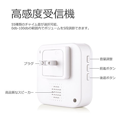 - 55種類のチャイム音がご選択でき、0db-100dbの範囲内でボリュームを5段調節できます。それぞれ違う環境によって、異なるのニーズに満たします。