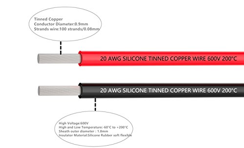 20 AWG電線[3 m黒と3 m赤] 20ゲージのシリコーンワイヤーフックアップワイヤー錫メッキ銅線のケーブル