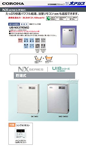 コロナ灯油ボイラー給湯専用貯湯式 UIB-NX37P(MS)高級ステンレス外装 前面排気型 メインリモコン付属のご紹介です。