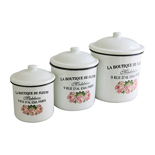 カンフィ、一番人気!! お花といえばやっぱりローズ! 優しいバラの柄が素敵な、ホーロー缶3点セットです。 眺めているだけで癒される、ピンクのバラ模様。 L、M、Sサイズ、三つ揃ってこのお値段は、とてもリーズナブル! 表面には「LA BOUTIQUE DE FLEURS」「Madeleine」「9 RUE D'AL ESA PARIS」の文字が。 パリのフラワーブティック「マドレーヌ」。 架空のお店で実際には存在しませんが、お花に囲まれた素敵なお店なのでしょうね。 そんなストーリーのある、フレンチ雑貨です。 アンティーク仕上げなので、直接食品を入れるときは、ビニール袋や紙袋をご使用ください。 キッチンでクッキーやキャンディー、コーヒー豆や調味料、粉などの保存用に、お部屋で散らかりやすい小物をしまったり。 アイディア次第で、大活躍間違いなし! サイズ L:Φ13cm×高さ15cm M:Φ11cm×高さ13cm S:Φ8cm×高さ10.5cm