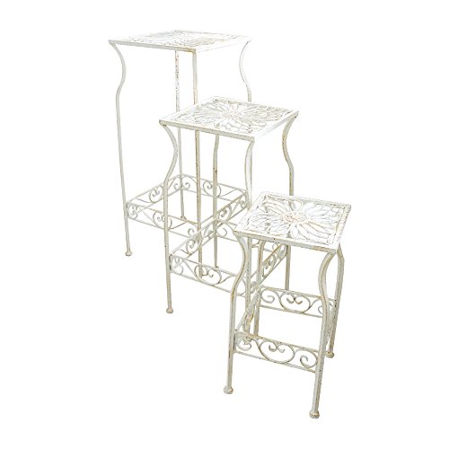程よく甘いインテリアをつくってくれる大人かわいいインテリア アンティークホワイトのエレガントなフラワースタンド3点セット ■花びらのデザインをしたエレガントな天板 アンティーク仕上げの味わいのあるホワイトカラー。 ヨーロピアンスタイルの繊細な装飾と色彩が女らしさを漂わせる 上品さをプラスした大人かわいいスイートなインテリアです ランプや花瓶、観葉植物を置く飾り台として使いやすい3サイズ、 使わないときは入れ子に収納できるのでとっても便利です 空間のアクセントにさりげなく置くだけで、ぐっと部屋の雰囲気が華やぐ 素敵なアイテムです。