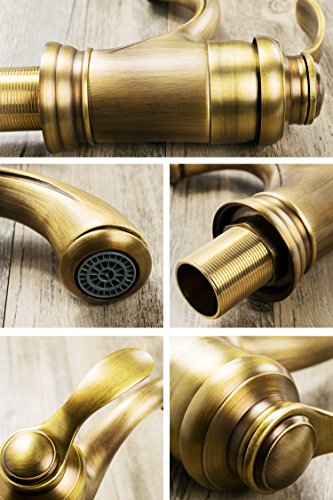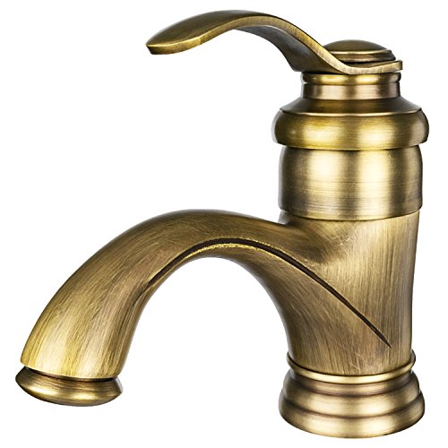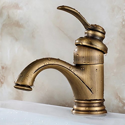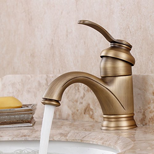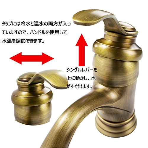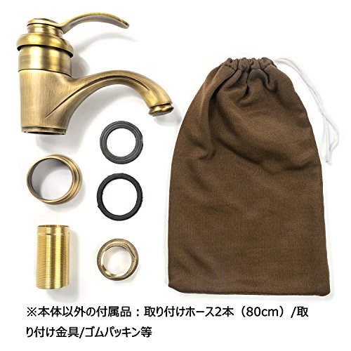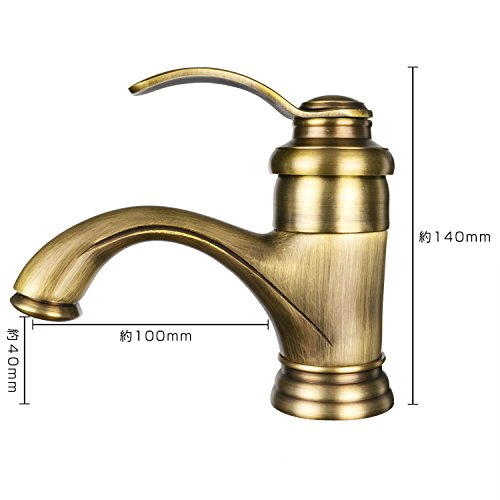 【CRSHIP】洗面用 混合水栓 蛇口 アンティーク 14cm シングルレバー 取り付けホース レトロ 手洗いボウル用 真鍮 冷熱調整可能 (古めゴールド)