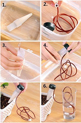 - 用法:1. ホースある給水器:緑のキャップを外して、(白い先端の部分は完全に浸すまで)水に15分ぐらい浸します。そしてパイプとキャップに水を入れて、満ちてからキャップを元にきっちり装着して、パイプの一端を水のある容器に置いて、白い主体の部分は土に差し込むだけでOKです。2.「ペットボトル対応」給水器:不用になったペットボトルを利用して、土に挿しておくだけで適量給水できます。ご使用前、キャップの側にある溝にはさみなどの尖った物で、穴を数個開けてください。