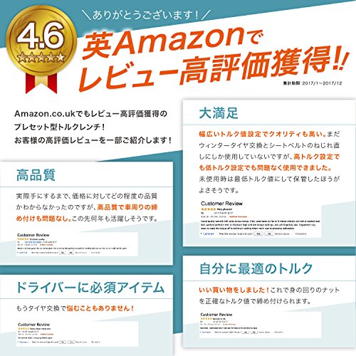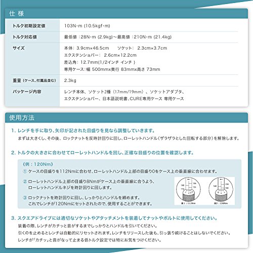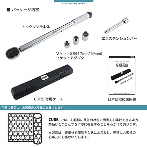 - 本製品は丁寧に梱包し、お客様のお手元にお届けします。安心の日本語取扱説明書も同梱いたします。【パッケージ内容】トルクレンチ本体、ソケット2種(17mm・19mm)、ソケットアダプタ、エクステンションバー、CURE専用ケース、日本語取扱説明書