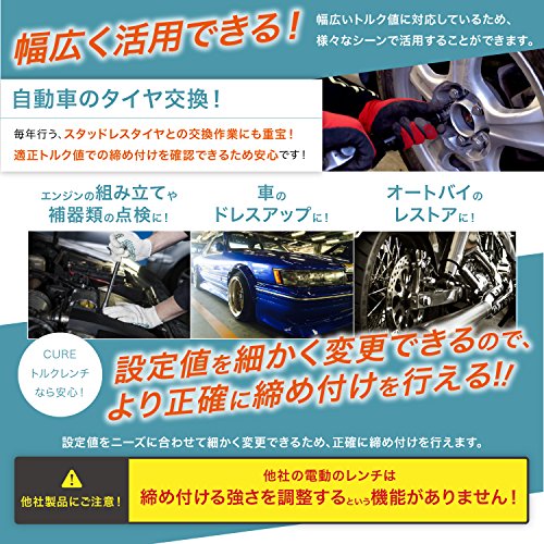 - 幅広いトルク値を設定できるので、用途もさまざま。車のタイヤ交換はもちろん、エンジンの組み立てや補器類の点検、車のドレスアップ、オートバイのレストアでも活躍します。まさに、ドライバーには必須アイテムです。