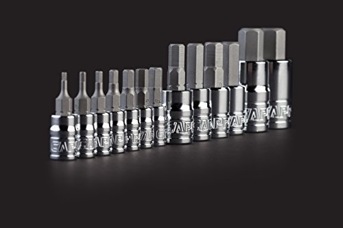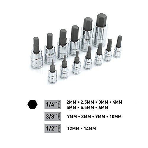 さまざまな作業に便利な、13種類の異なるメトリックサイズを備えたCapri Tools(カプリ ツールズ)セットです。高品質のドロップ鍛造調質処理S2鋼製トルクス ソケットビットを提供します。クロムメッキ仕様により、耐油性と耐食性を備えています。セットを整理しやすいように、保護保管ケースが付属します。本セットは、ブレーカーバー、トルクレンチ、ラチェットハンドルとの使用に最適です。Capri Tools(カプリ ツールズ)は、永久交換保証を提供しています。セット内容 1/4 インチ(6.35mm) ドライバー -- 2mm、2.5mm、3mm、4mm、5mm、5.5mm、6 mm (長さ37 mm )。3/8 インチ(9.52mm) ドライバー - 7mm、8mm、9mm、10mm、12mm(長さ48mm )。1/2 インチ(12.7mm) ドライバー - 14mm (長さ55mm)。