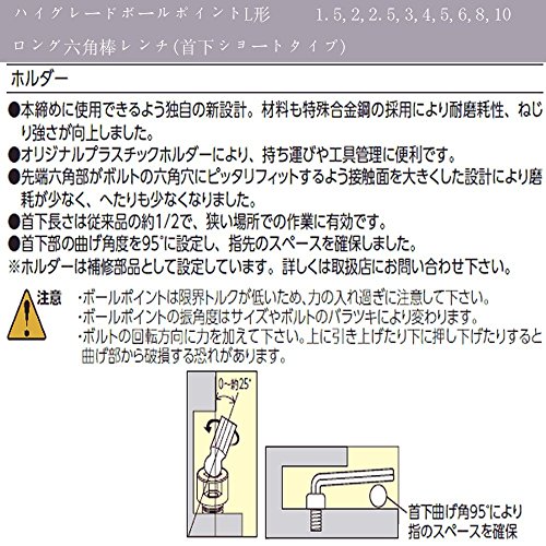ボールポイント形状により狭い場所や障害物のある場所でも、斜めから六角穴に挿入できます。 ハードクロームメッキ処理により、摩耗・腐食を防ぎます。
