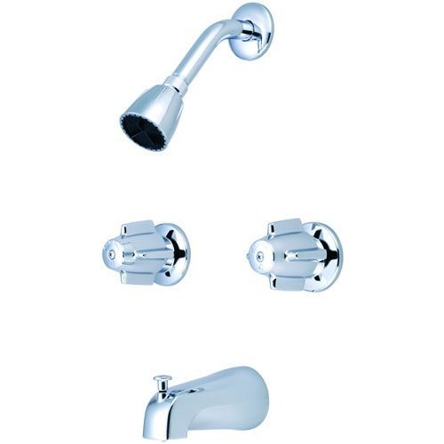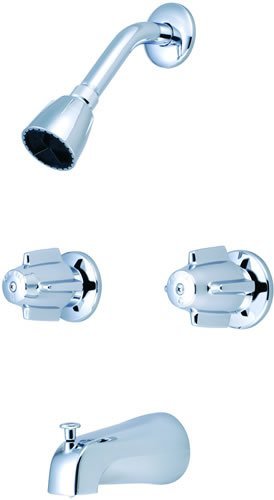 Product Description The two-valve bath and shower fitting is made with a cast brass body with replaceable seats designed for I.P. union connections. The stem units are all brass, with a reinforced rubber packing and rubber seat washer. The stem units can be easily replaced from the front of the fitting without removing the valve body. The fitting is supplied with an internal transfer valve that prevents shower flow when the spout is open for tub flow. The handles, 1/2-inch IPS spout and escutcheons are zinc die cast with a chrome plated finish. The shower arm is brass with a chrome plated finish, the escutcheon is stainless steel and the shower head is chrome plated plastic. From the Manufacturer The two-valve bath and shower fitting is made with a cast brass body with replaceable seats designed for I.P. union connections. The stem units are all brass, with a reinforced rubber packing and rubber seat washer. The stem units can be easily replaced from the front of the fitting without removing the valve body. The fitting is supplied with an internal transfer valve that prevents shower flow when the spout is open for tub flow. The handles, 1/2-inch IPS spout and escutcheons are zinc die cast with a chrome plated finish. The shower arm is brass with a chrome plated finish, the escutcheon is stainless steel and the shower head is chrome plated plastic.