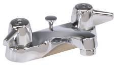 The lavatory centerset is designed with a solid cast brass body with shanks located on four inch centers for supply connections and mounting. The stems are all brass, with a double O-Ring seal and rubber seat washer (for compression stems) or ceramic sealing discs (for ceramic units). The canopy handles are zinc die cast with a chrome plated finish. The faucet body is polished and copper, nickel, and chrome plated. The faucet is fitted with a water saving aerator that limits the flow rate. The pop up drain is brass with a chrome plated finish. The stopper and guide assembly can be easily removed for cleaning.