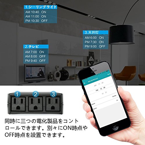 1 in 3、最大出力10A、それぞれは最大1200W対応できます。 三連のソケットは同時に三つの電化製品をコントロールできますが、別々にON/OFFコントロールと識別名を指定可能です。
