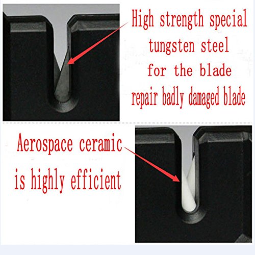 - Pre-set carbide blades for quickly restoring a dull edge. Specially shaped ceramic stones for a razor-sharp finish.